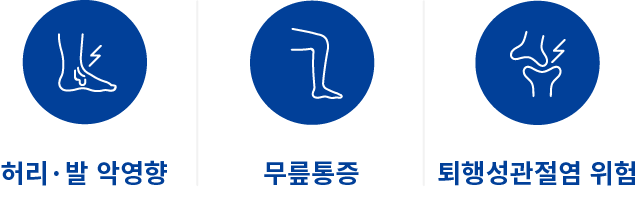 다리는 우리가 이동이 가능하도록 하는 부분으로, 체중의 무게를 가장 크게 받는 자리입니다. 따라서 하중을 가장 크게 받는 다리의 경우 휜 다리로 각도가 틀어지게 체중의 무게가 불균일하게 분산되며 다리 건강에 큰 영향을 미칩니다. 이는 무릎 통증을 유발하고 방치할 경우 퇴행성 관절염까지도 발병할 수 있습니다.